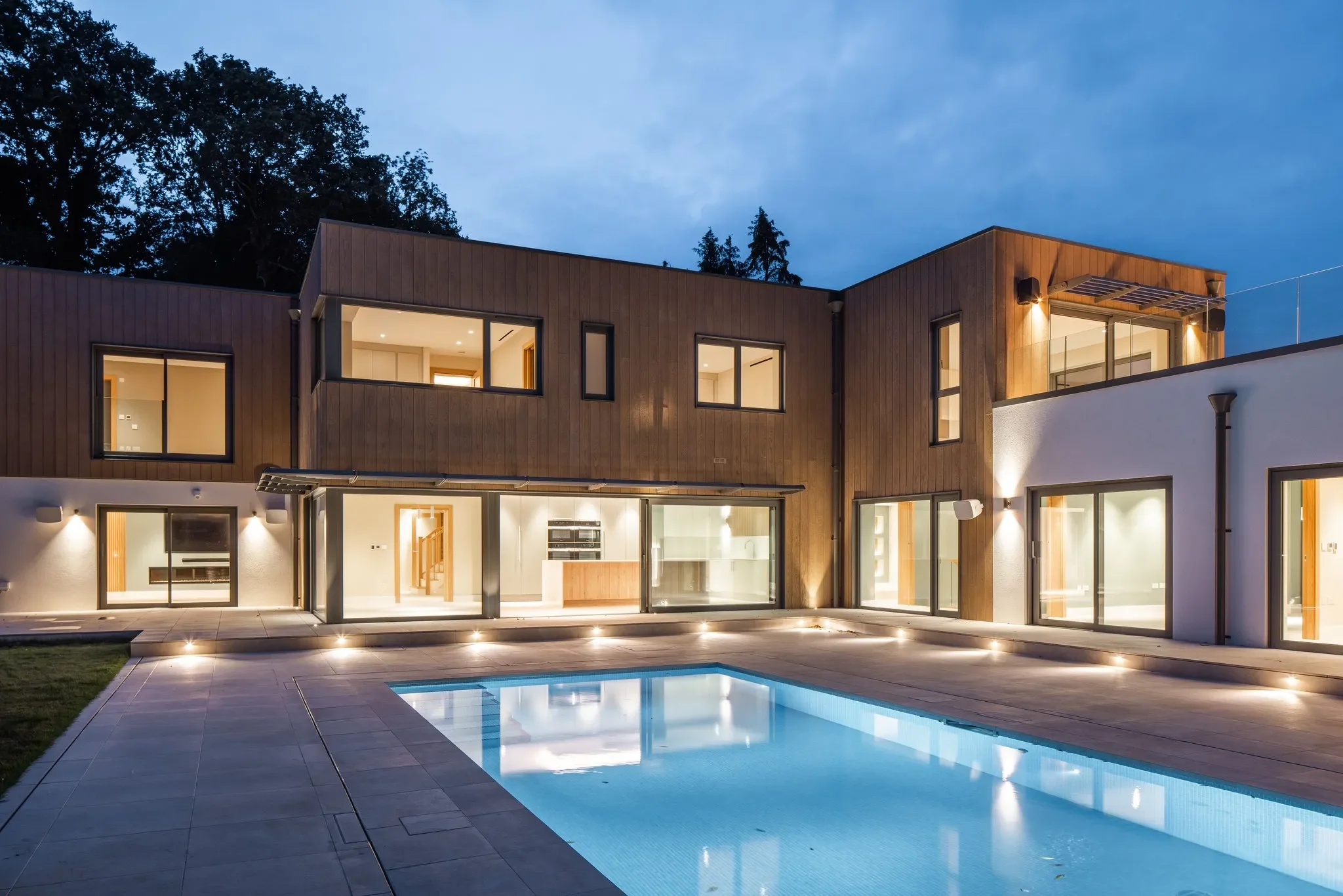 Externally, the house is set within approximately 2.1 acres of valley type private grounds, with a 400m² courtyard and pool terrace forming the focal point of the outdoor space. A swimming pool, supported by dedicated plant and service areas, reinforces the practical nature of the design.